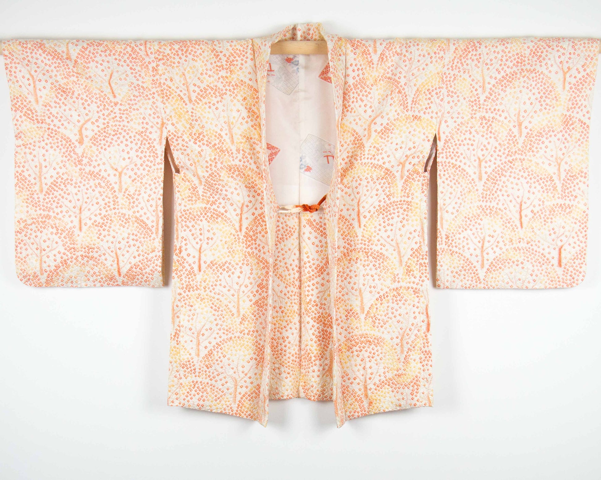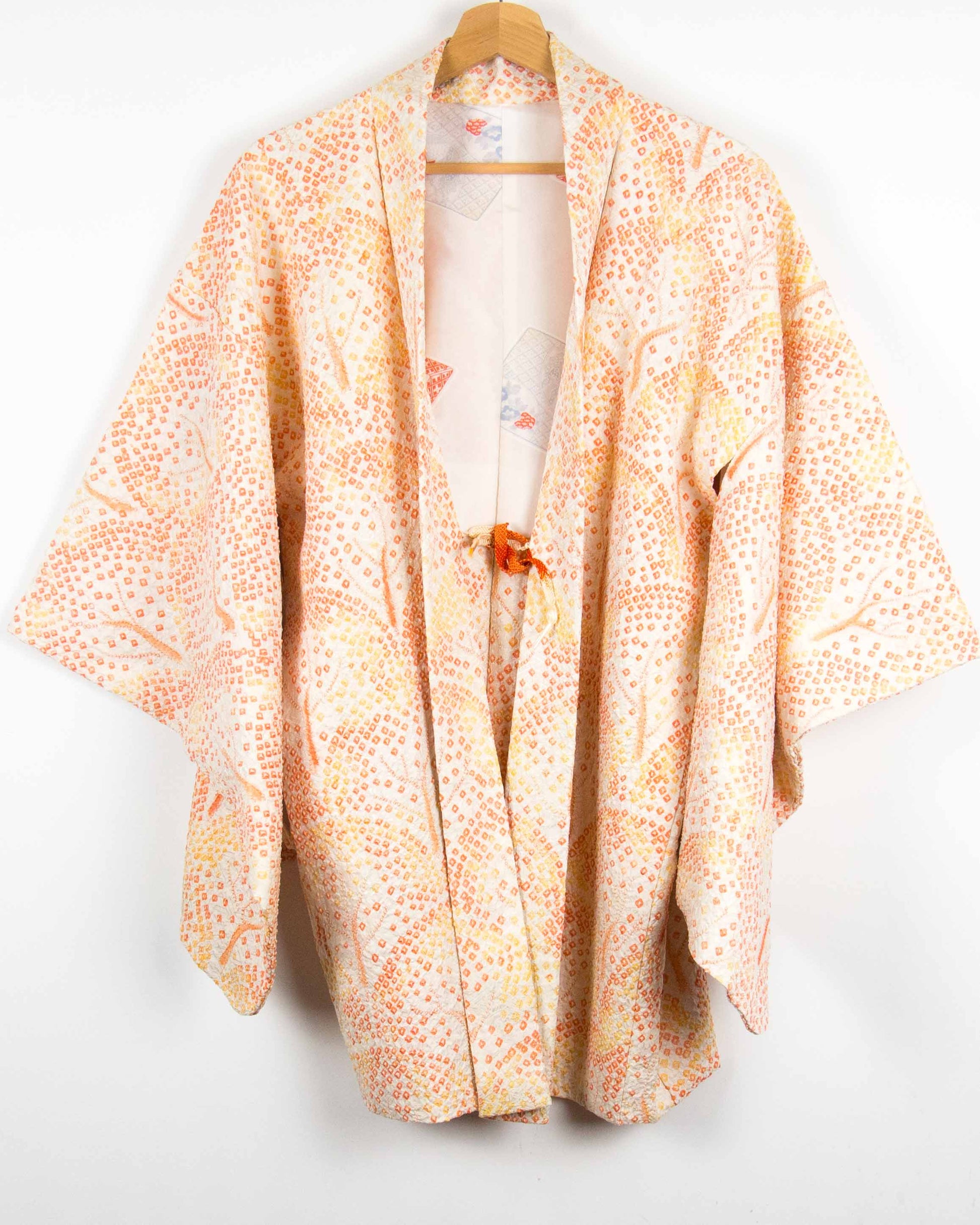 A pretty stylized paulownia tree design in an all-over shibori pattern similar to the ancient tree of life motif, covers this vintage silk haori kimono jacket.