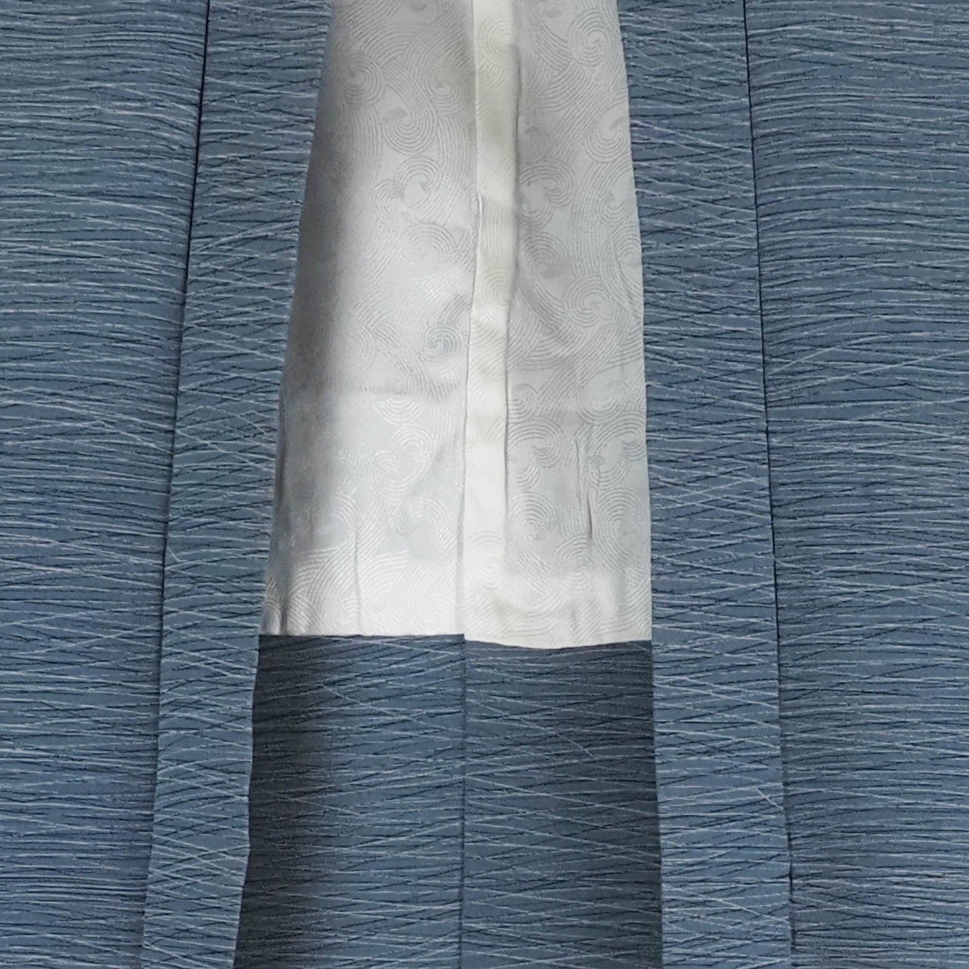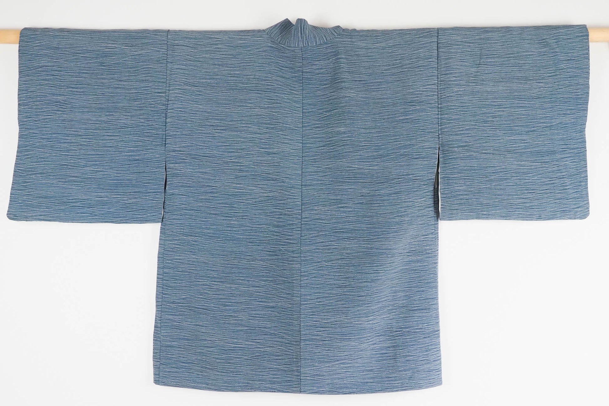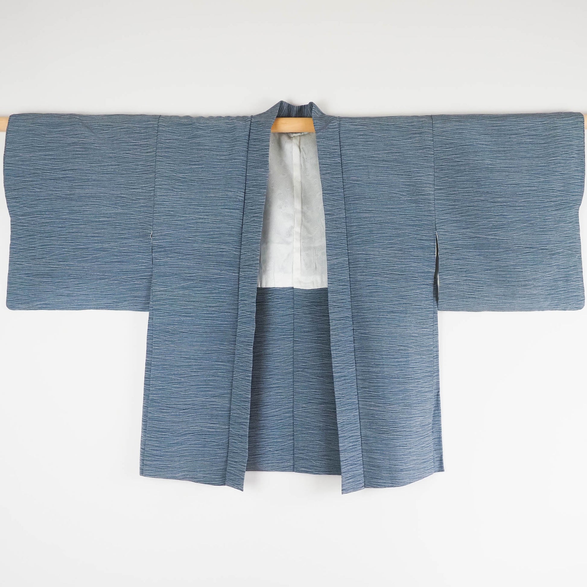 Vintage silk haori featuring a pattern of abstract pampas grasses in tonal shades on a blue-grey background. The white silk rinzu lining has a swirling stream design and the jacket has cocoa brown silk himo ties.