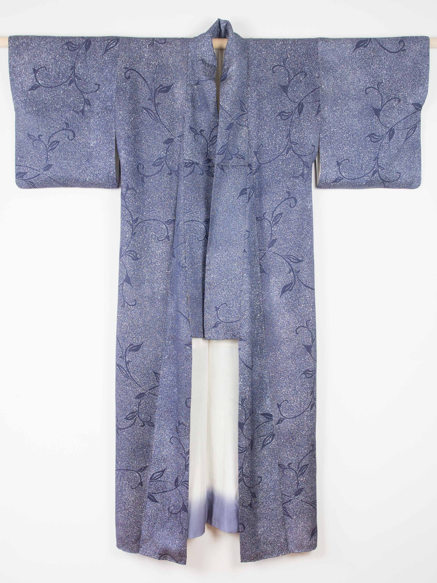 The kimono has a white silk lining and blue bokashi (ombre) silk hakkake (the inner cuff and hem of the lining) and is in excellent condition. Karakusa (literally 'a foreign or winding plant') is an ancient arabesque pattern brought to Japan from the middle east and is comprised of spirals influenced by vines and other natural forms.