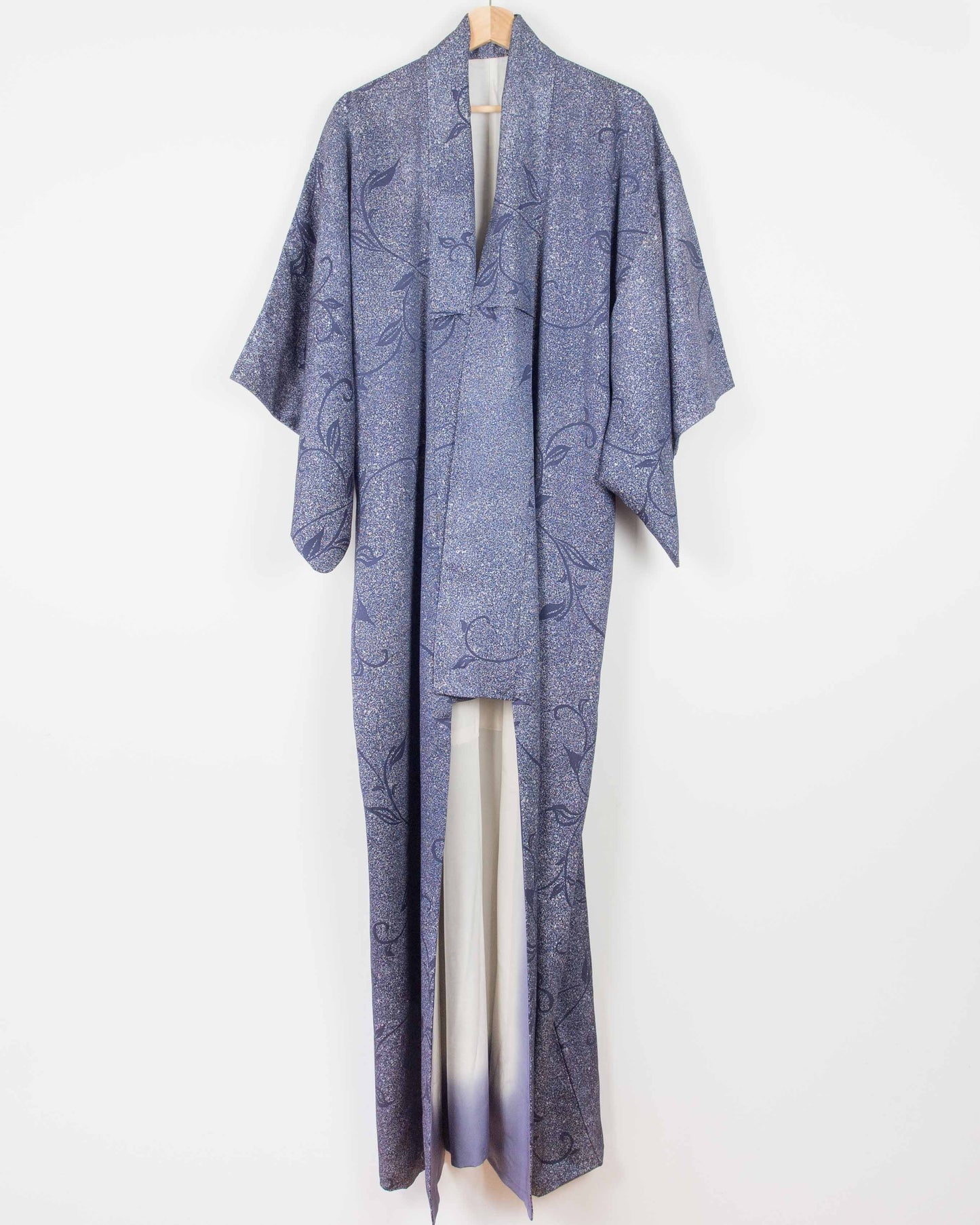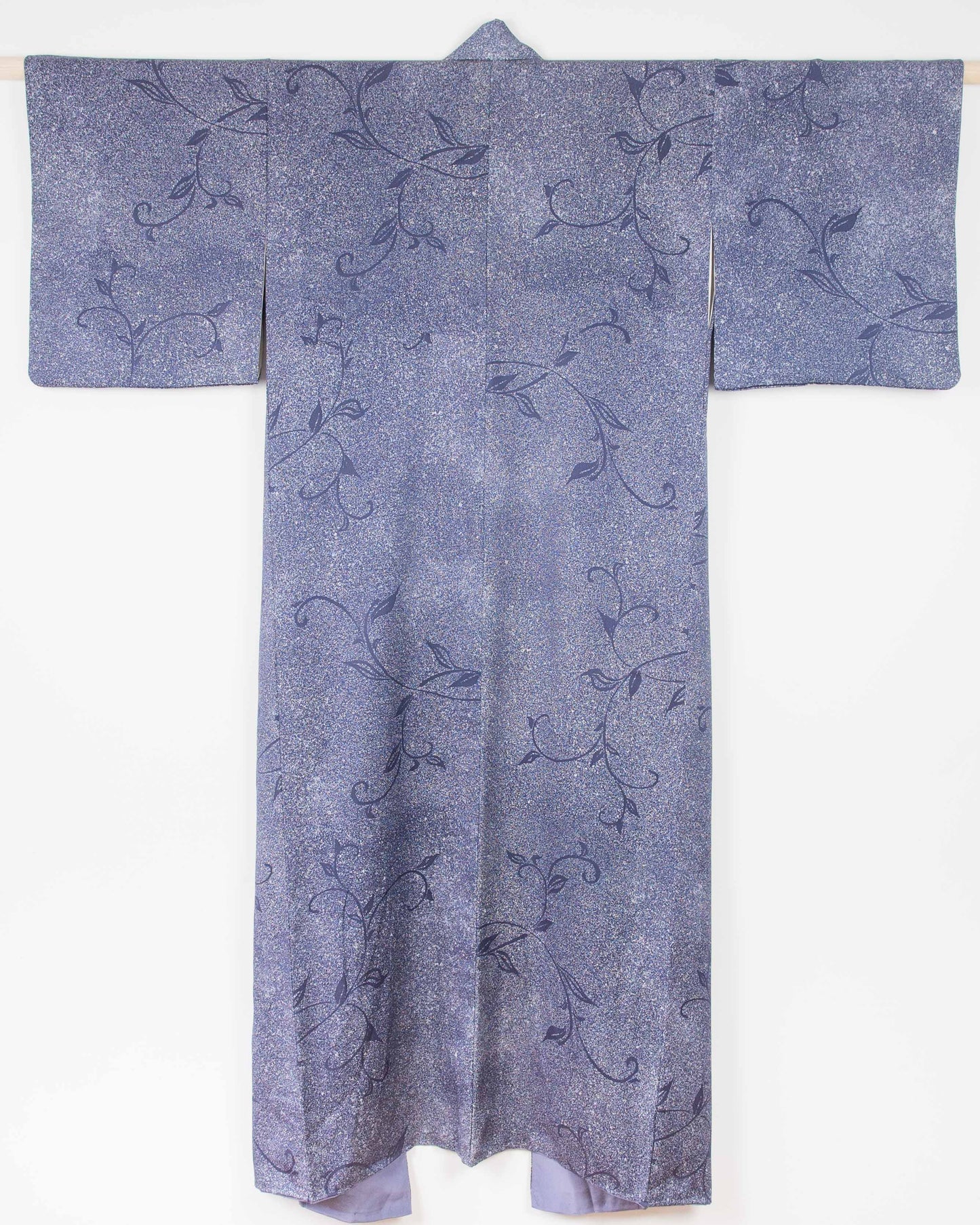 A deep blue vintage silk kimono with single floral arabesque (kararkusa) motifs and a lovely snow-storm effect created by roketsuzome a wax-resist type dyeing technique similar to batik.