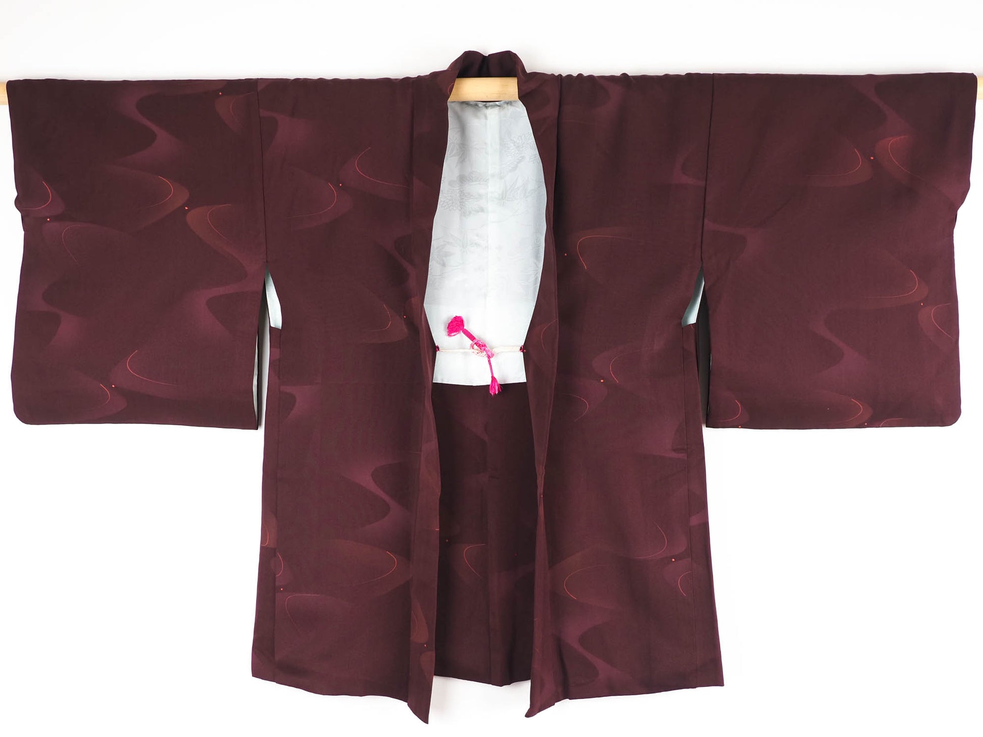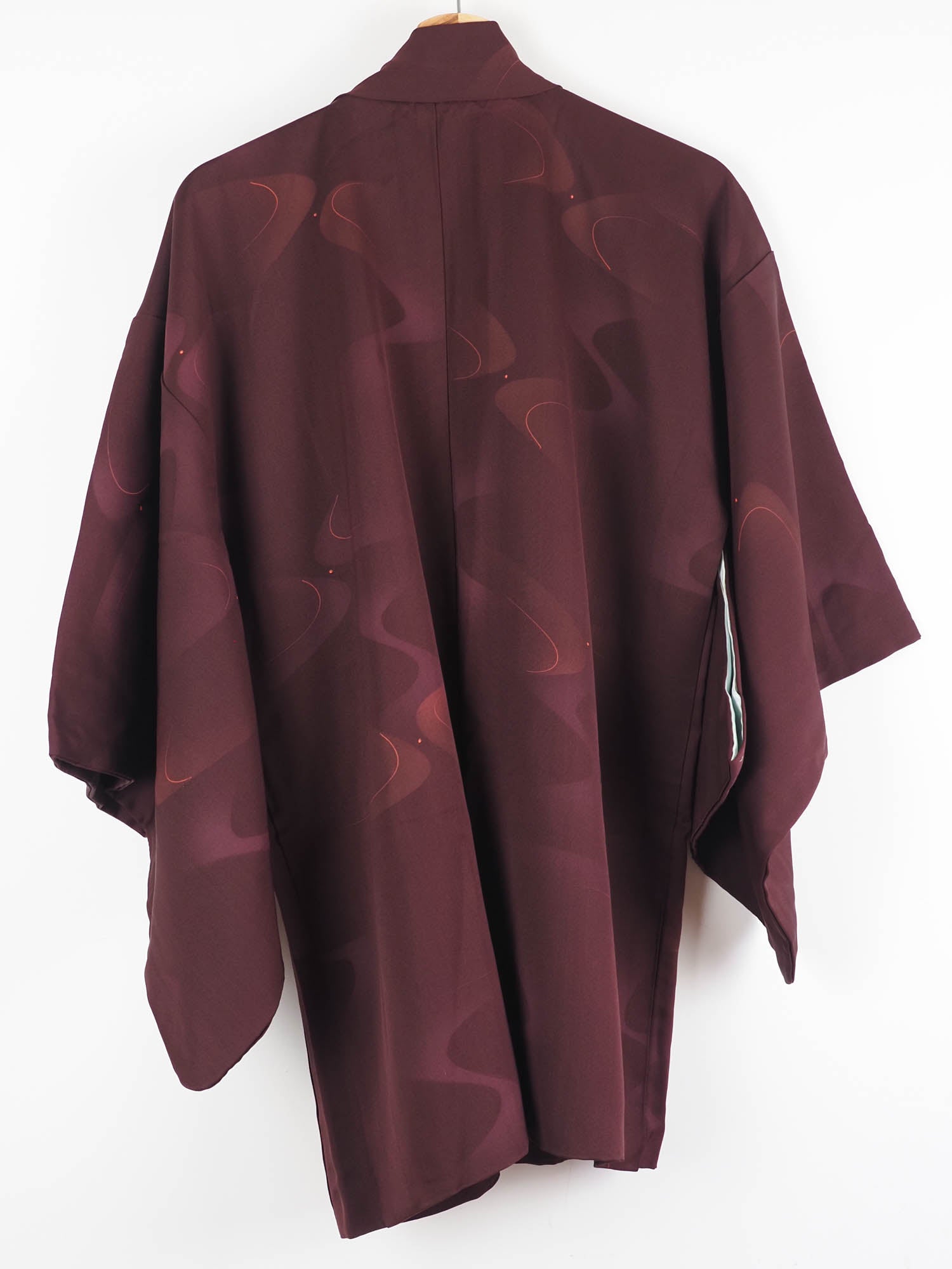 An elegant smooth burgundy silk haori with an all-over design of shaded self-coloured swirls highlighted with gold lines. This form of abstract pattern is used in the traditional Japanese representation of water.