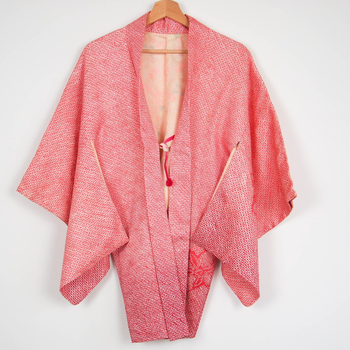 Vintage candy pink ombre silk shibori haori with pretty blossom motifs. This kimono jacket would be a great summer cover-up for a sophisticated casual look.