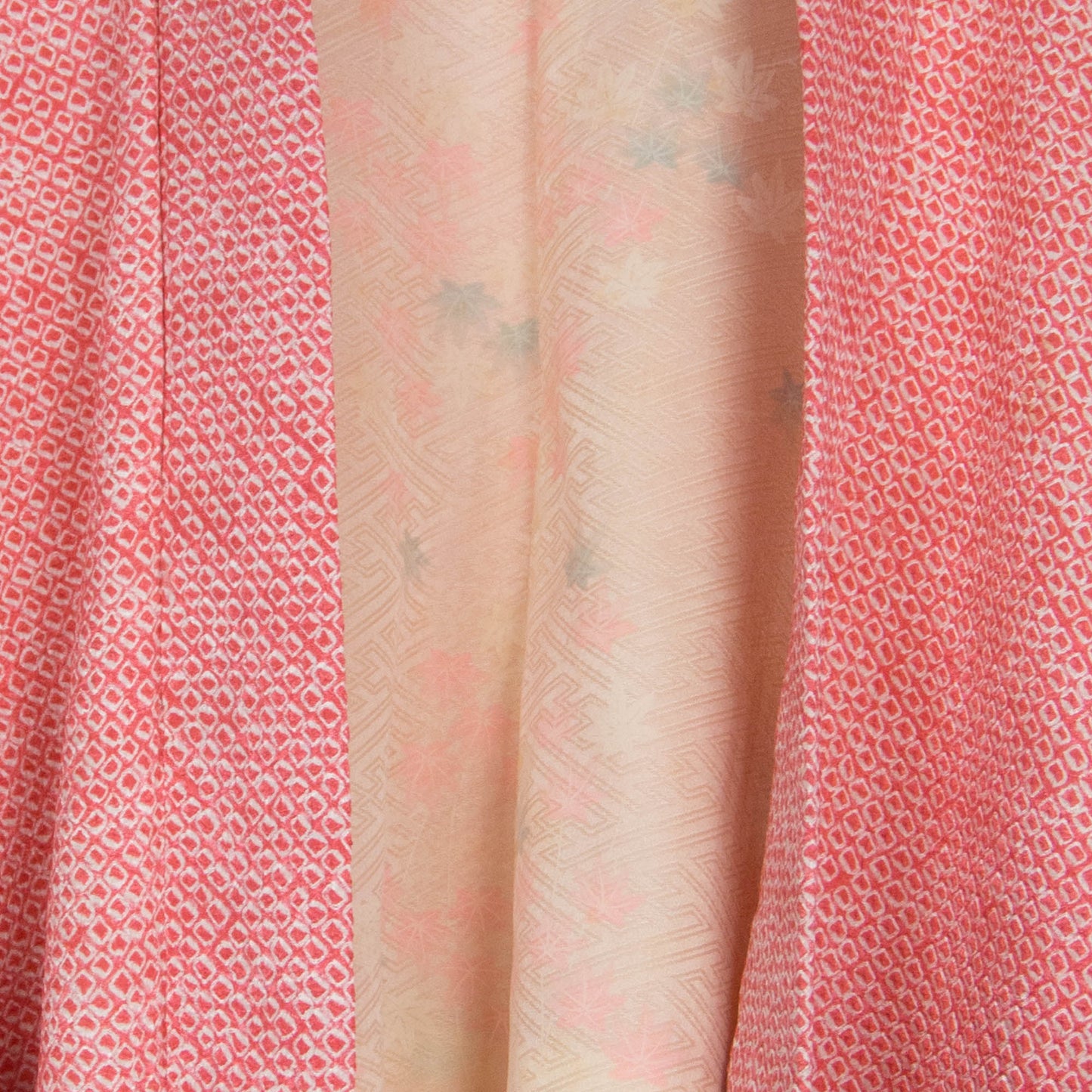 The haori has a cream silk rinzu lining with a woven sayagata pattern overprinted with pink & blue maple leaves. Rinzu is a silk damask fabric in which a subtle, repeat satin pattern is woven onto a matte background.