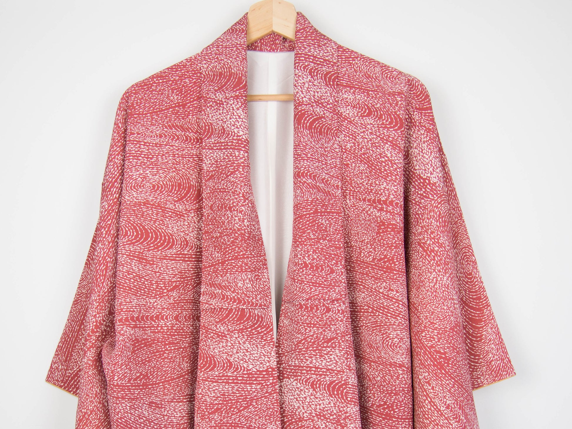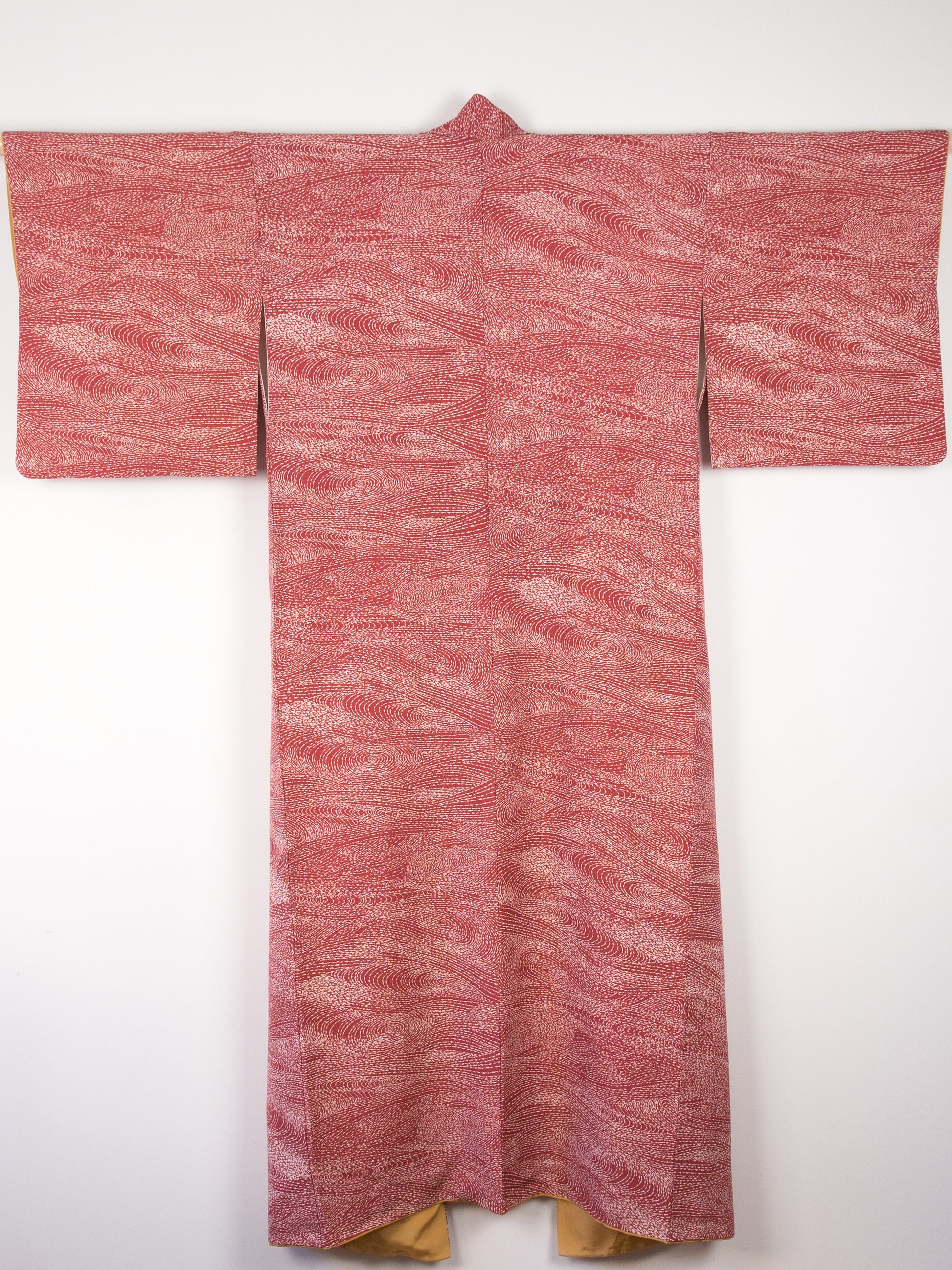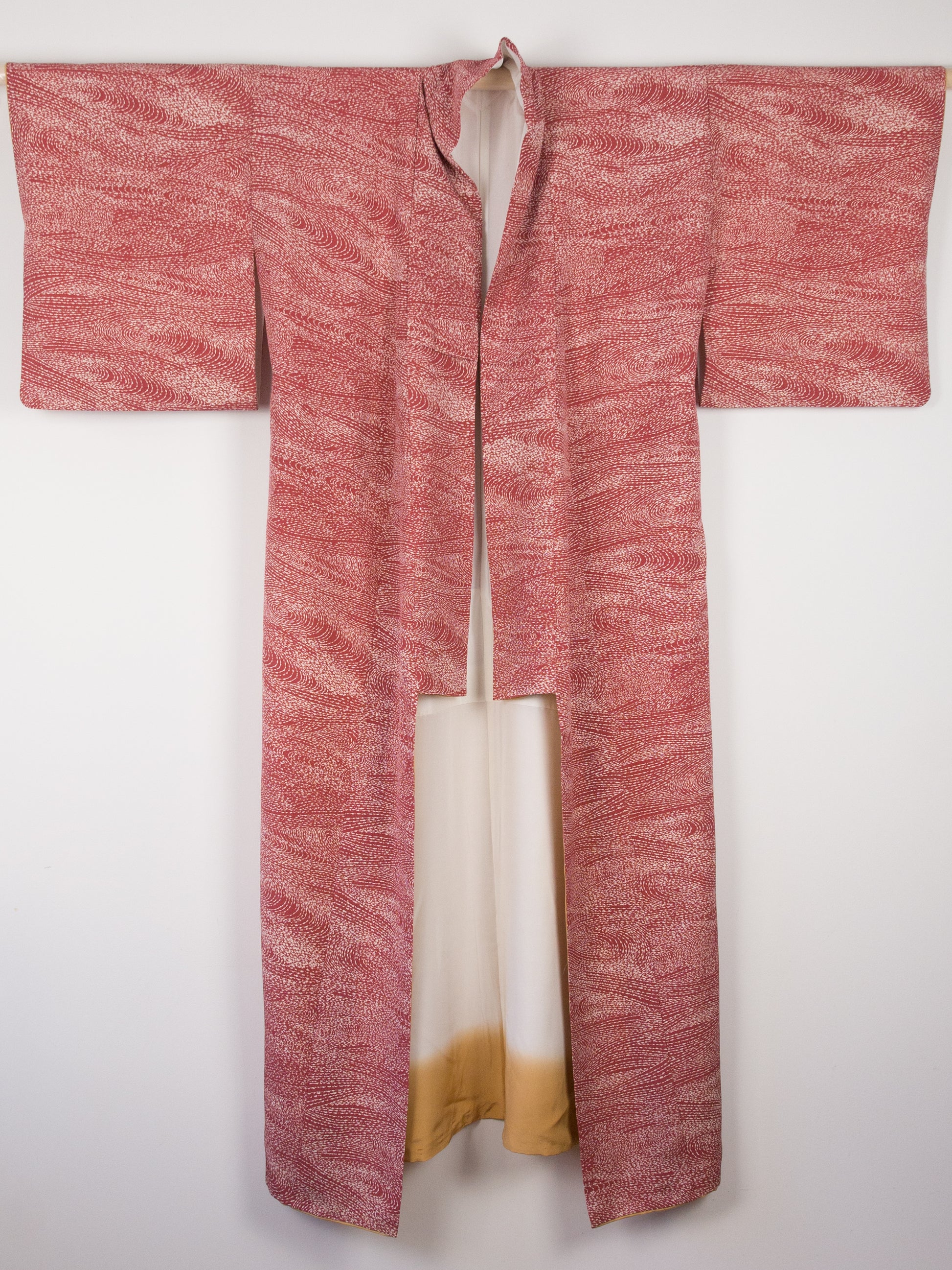 This komon (small print) kimono has a modern take on the traditional Japanese motif of wild waves or araumi in white on a coral-coloured background. The kimono has an off-white silk inner and ochre bokashi (ombre) silk hakkake (the inner cuff and hem of the lining).