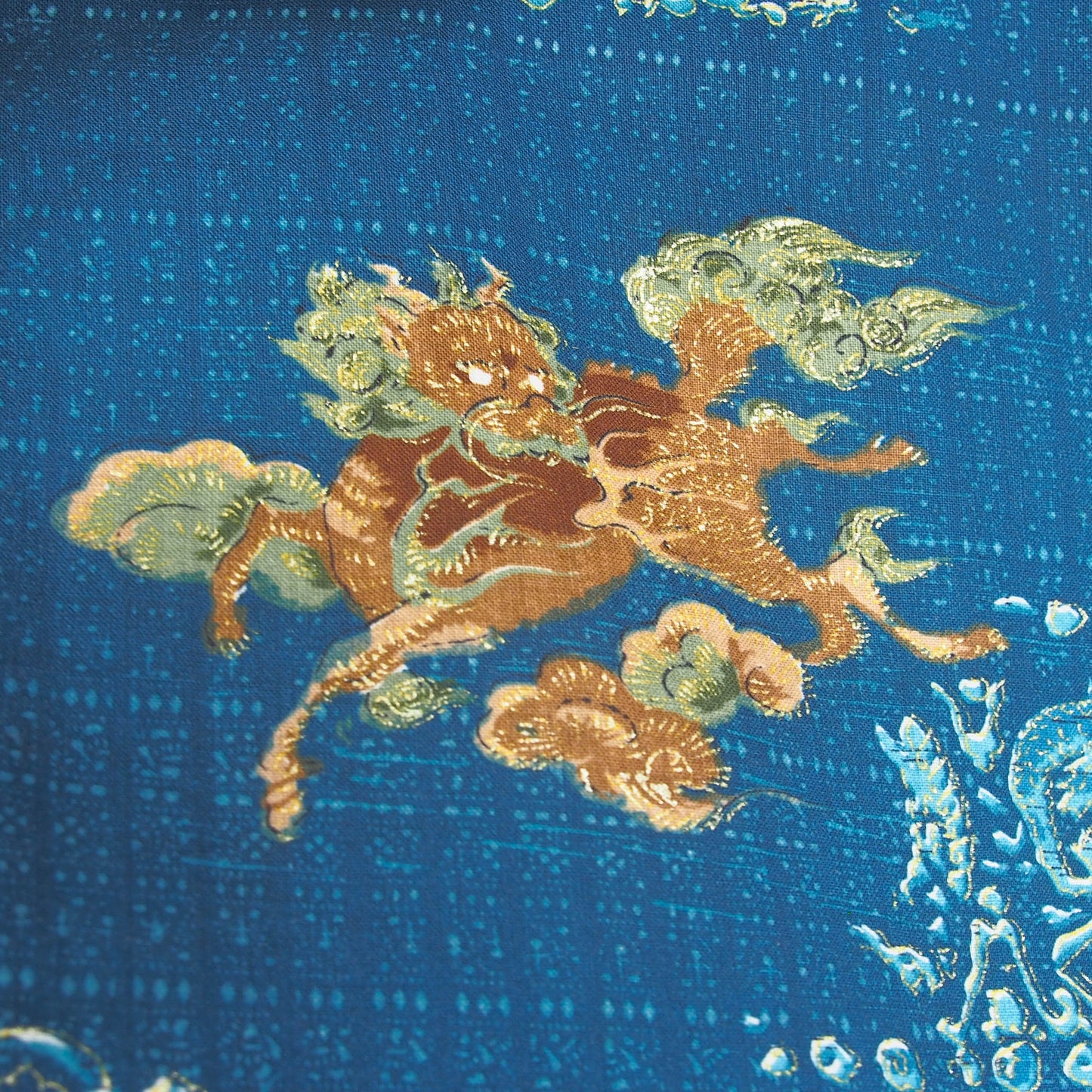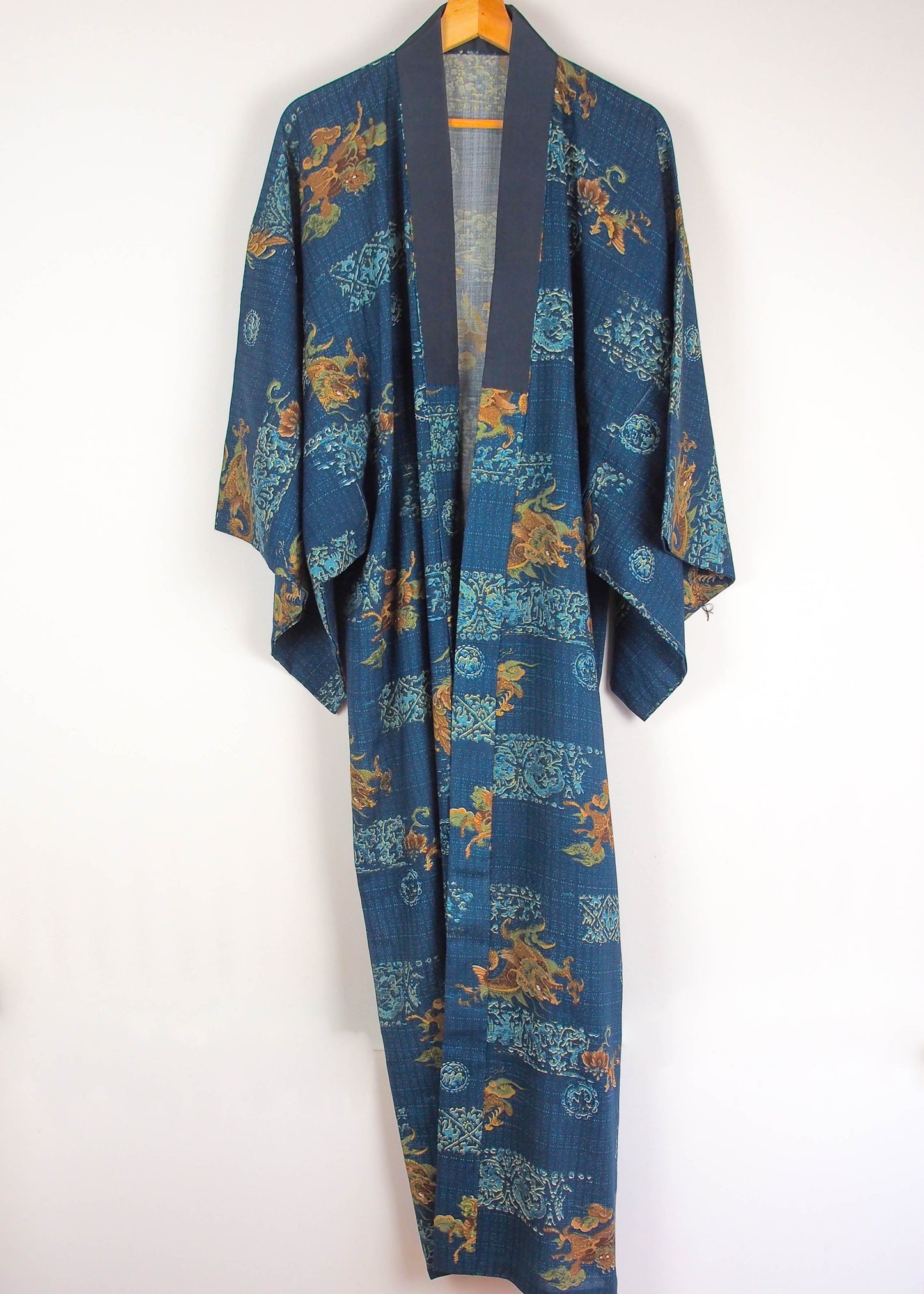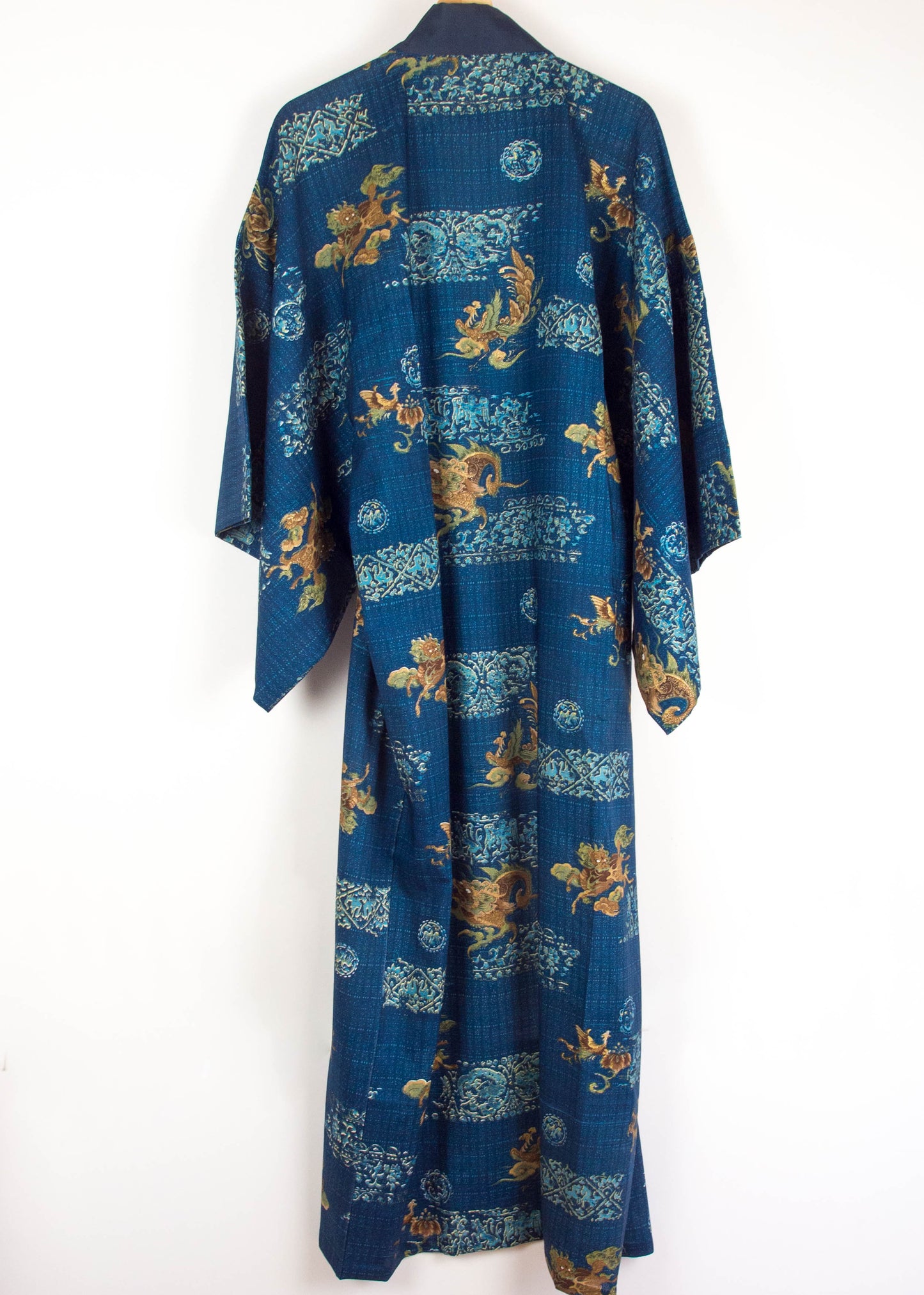An antique mens cotton muslin juban with a bold printed repeat design featuring a swooping dragon & phoenix highlighted in gold (kinsai) on a dark teal blue background . This would make a stylish wrap for either a man or a woman.