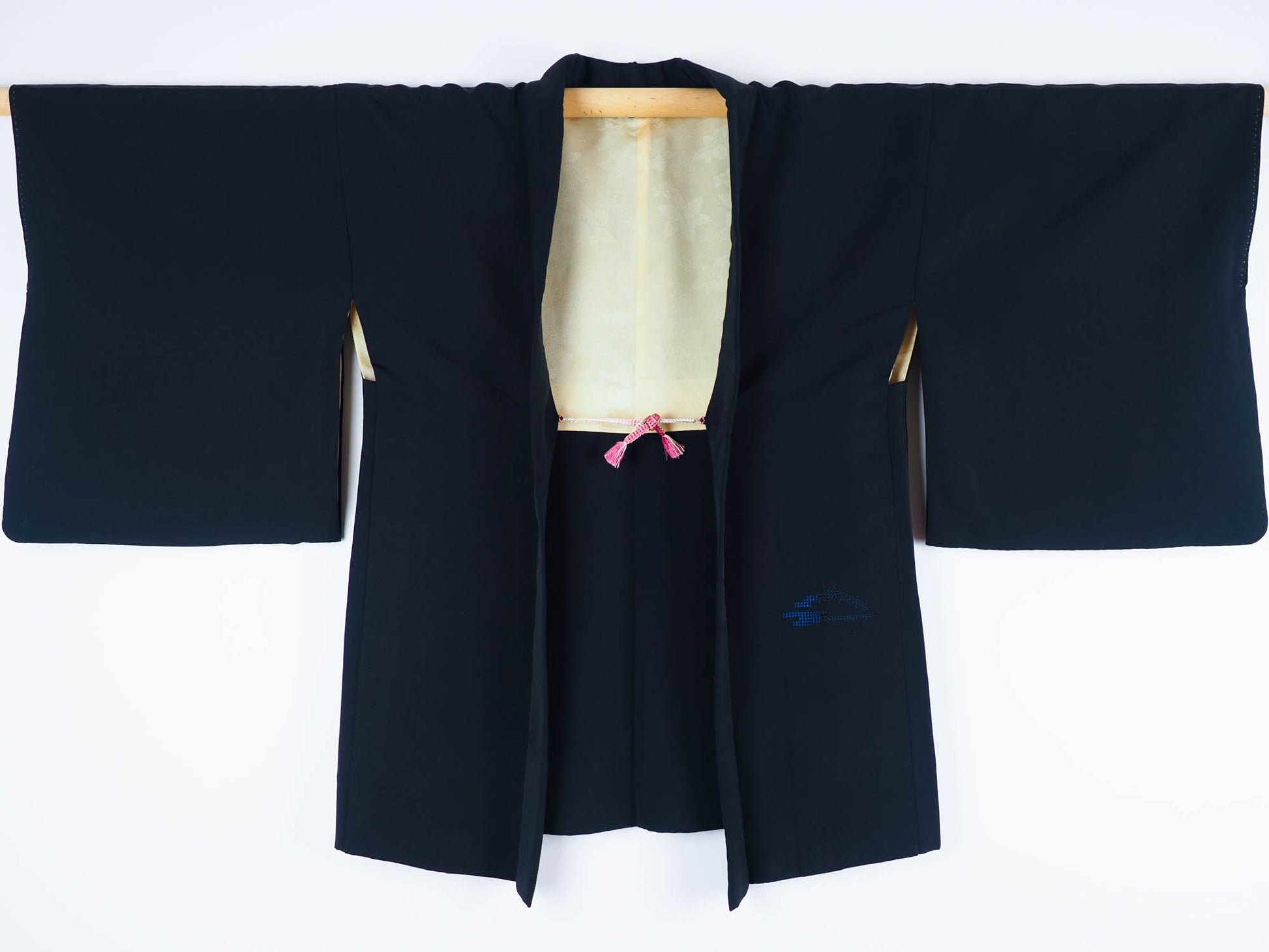 The cream silk lining has a mass of rinzu flowers. Rinzu is a silk damask fabric in which a subtle, repeat satin pattern is woven onto a matte background. The jacket fastens with white & pink silk himo ties accented with gold thread.