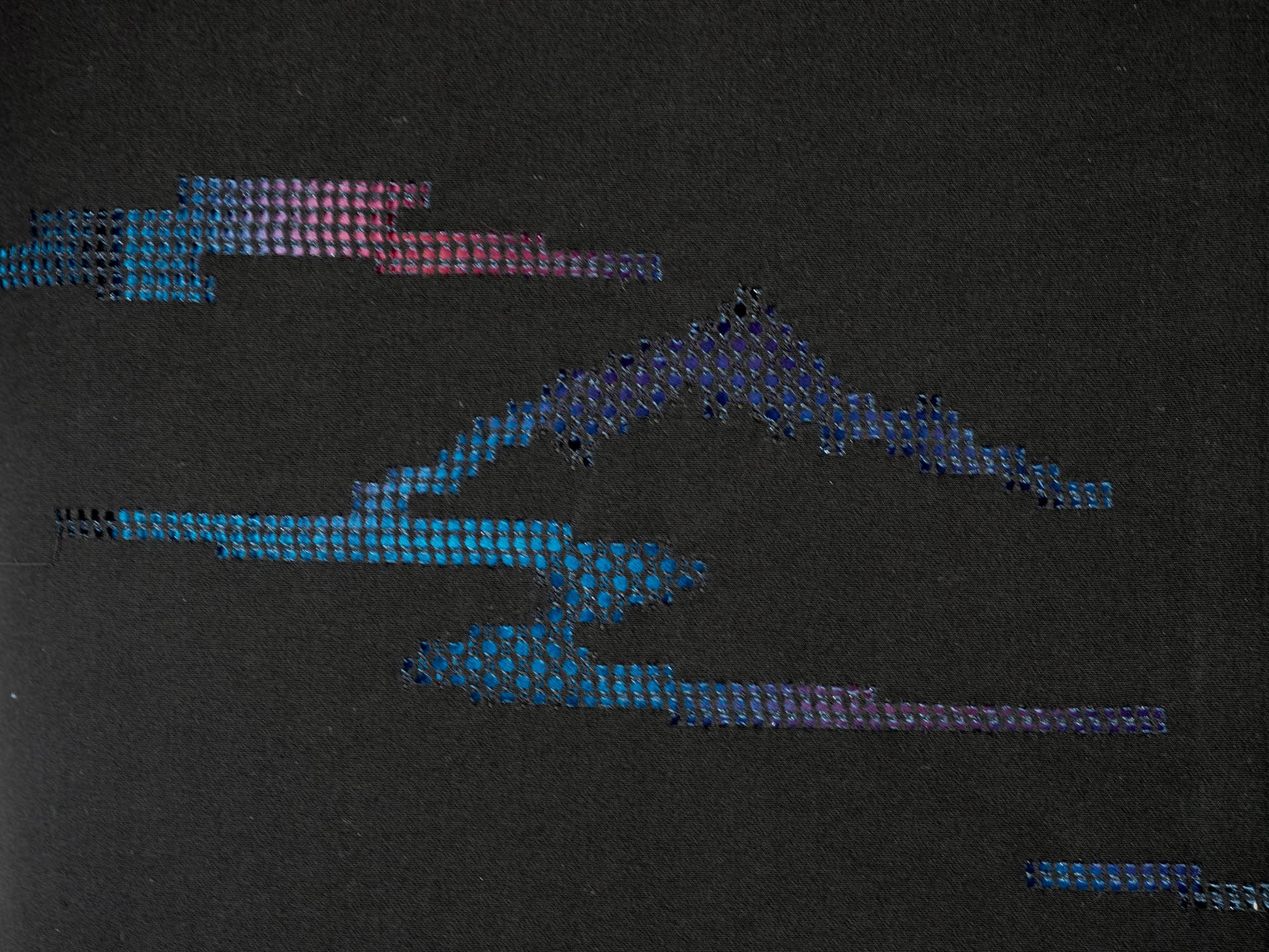A pretty plain black kimono jacket with abstract cutwork embroidery motifs that resemble sunset above mountains and sea. The fabric behind the lace effect created by the cutwork embroidery has an ombre effect in shades of blue and pink.
