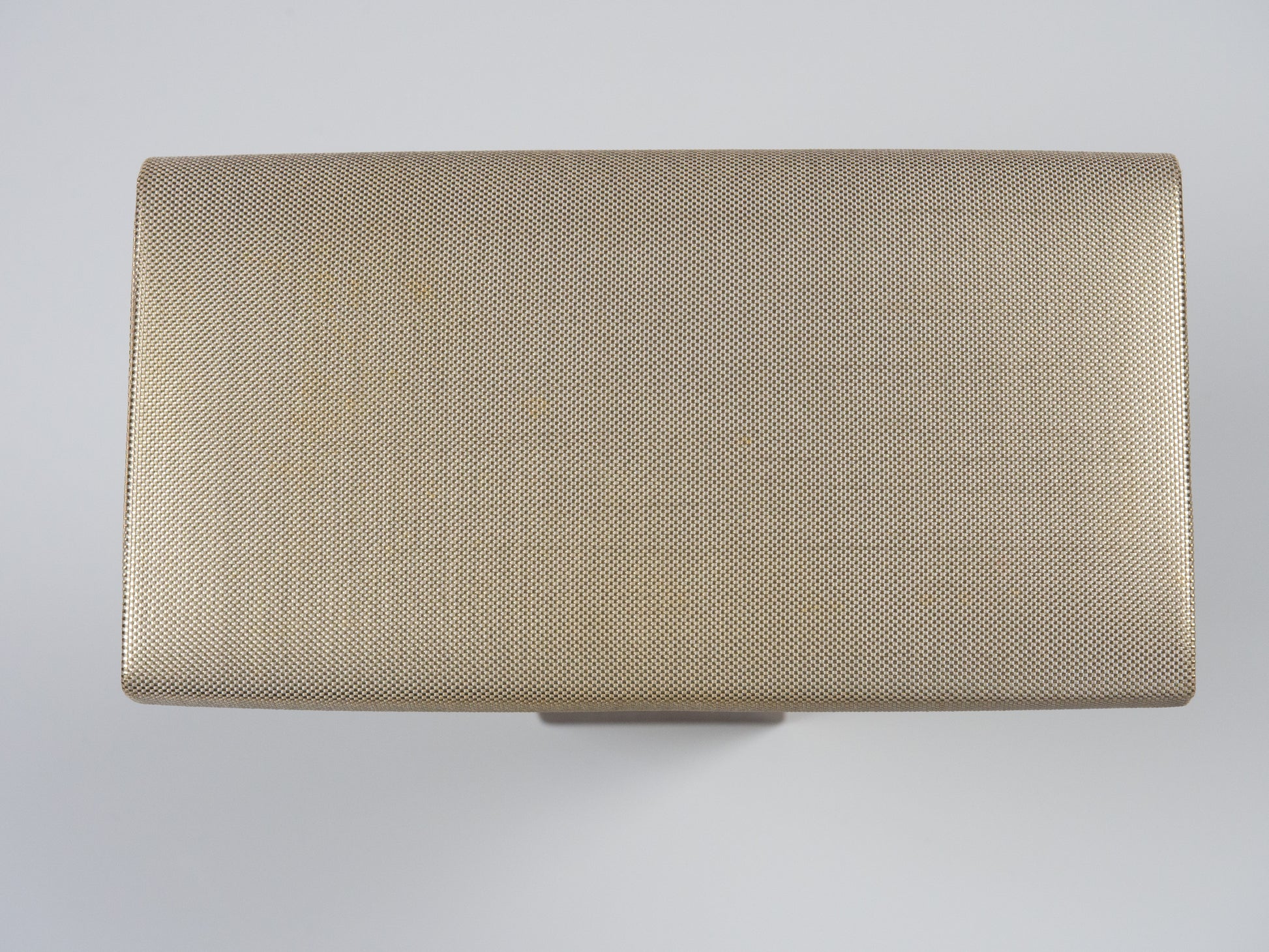 A slim box clutch covered with an a gold brocade silk woven with graduated horizontal purple stripes on the front flap. This bag has a plain silk interior and is fastened with a large gilt press stud. The interior has a slim credit card sized pocket.