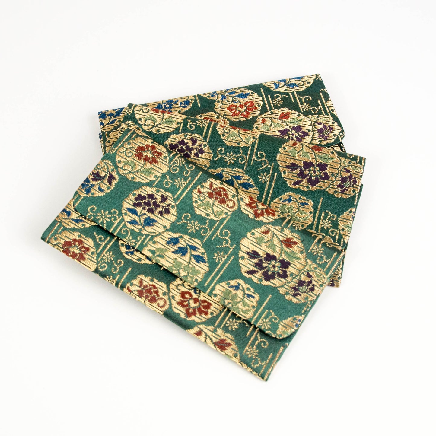 An antique (C. 1950) Japanese brocade wallet with circular gold floral crests on a green satin background. Large enough to hold tissues, a face mask or other small items.