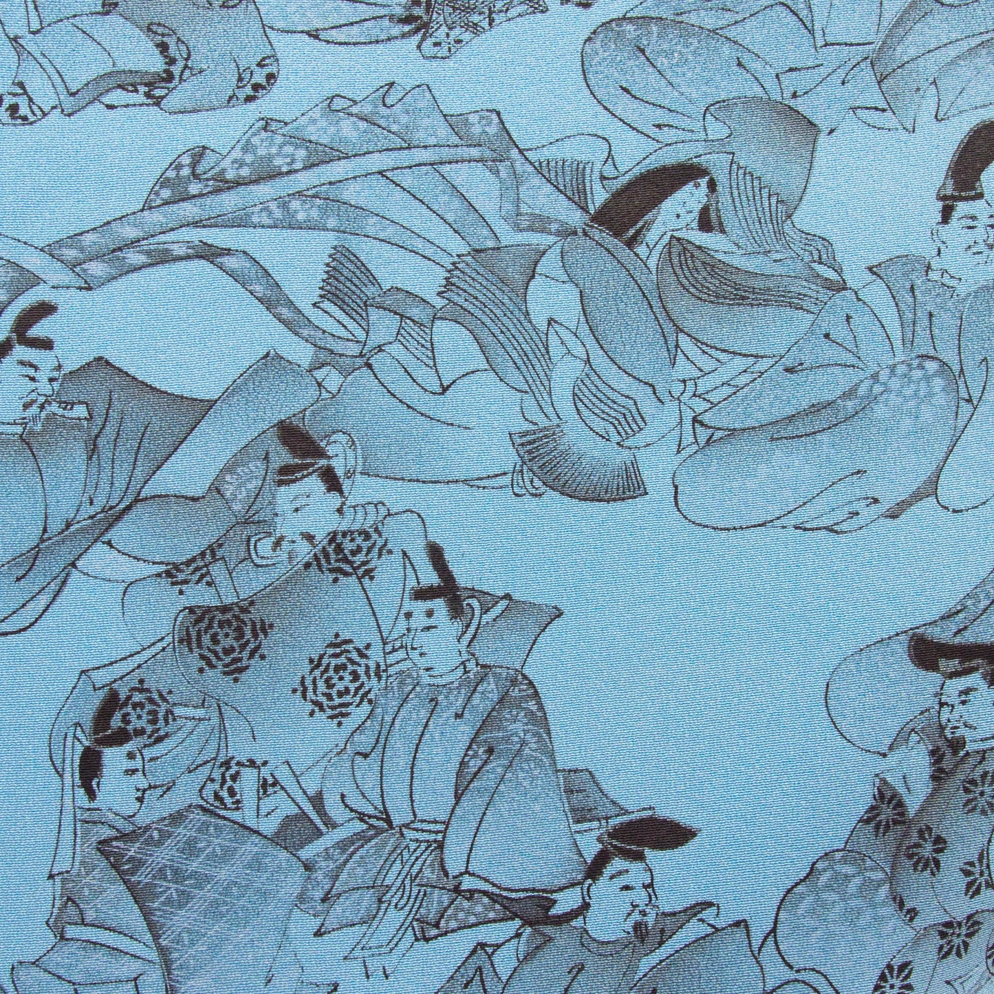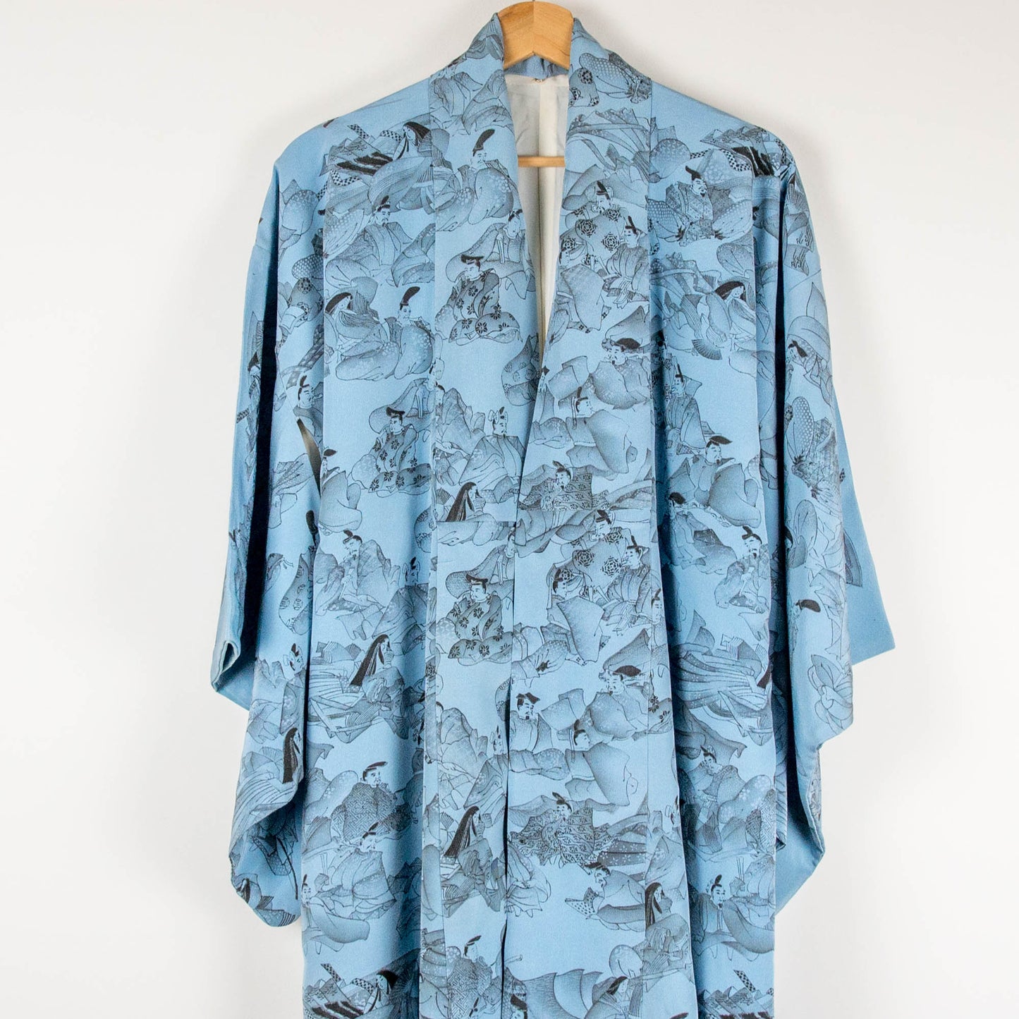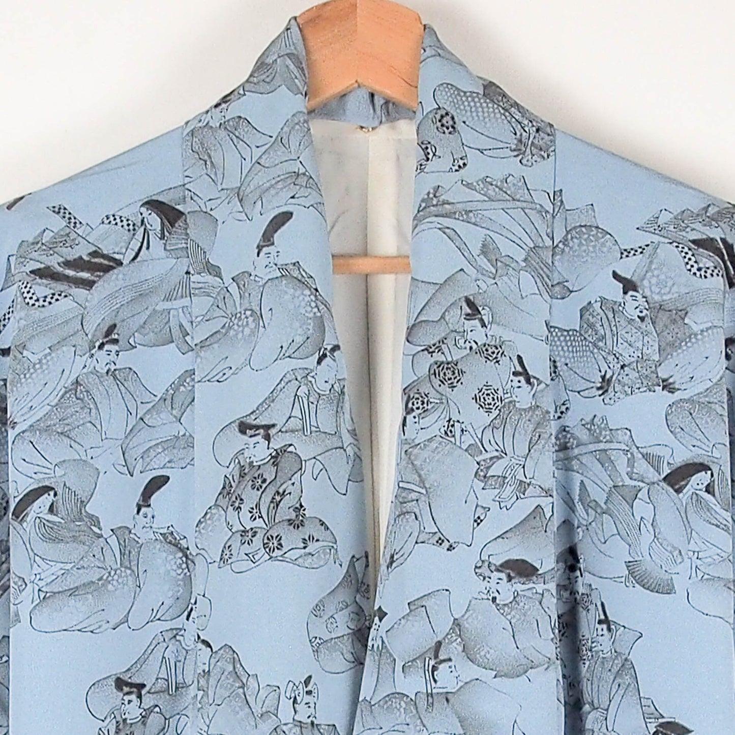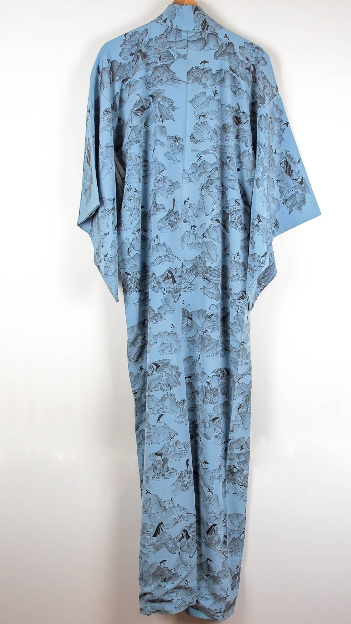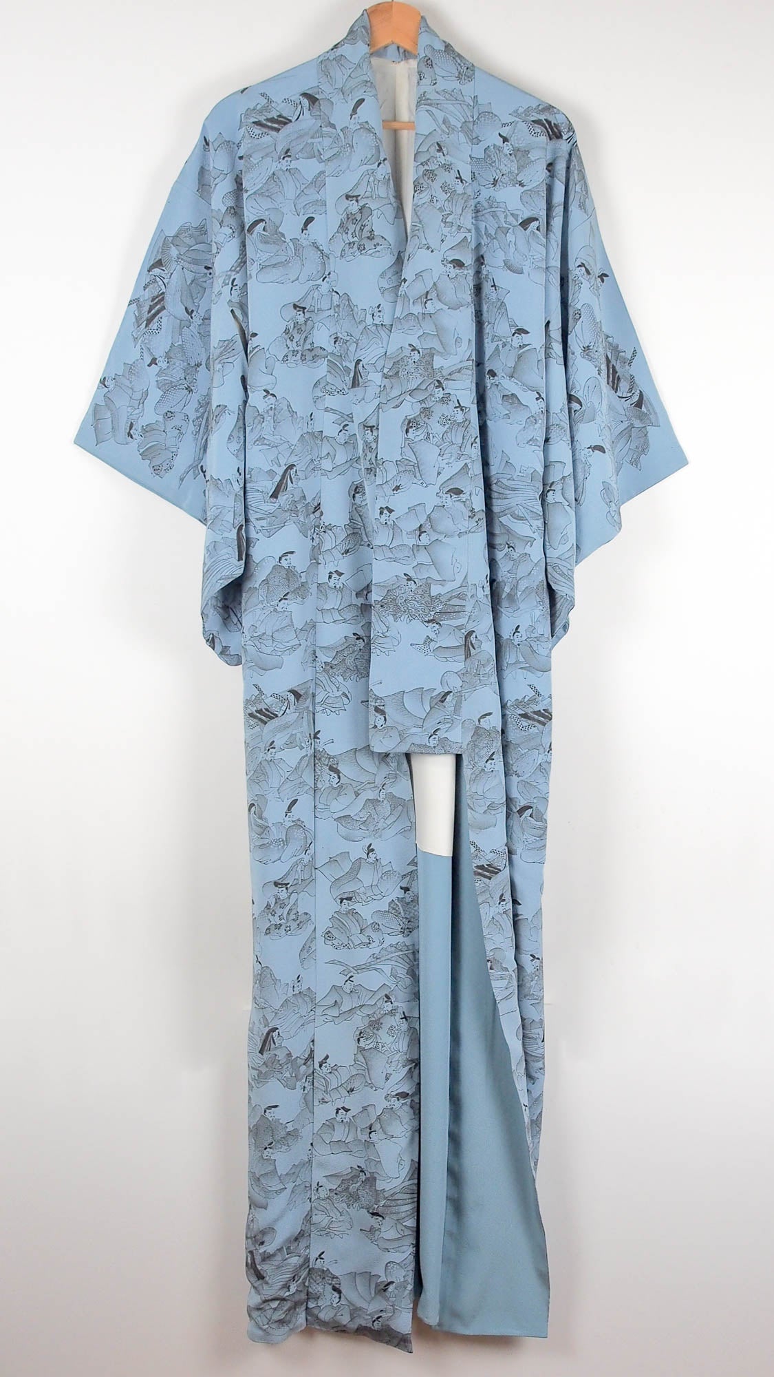 A pale blue vintage silk kimono with attractive repeated print of line drawings of seated figures in historical dress. The medium weight silk is lined in plain white silk with a plain blue hakkake (the inner cuff and hem of the lining).