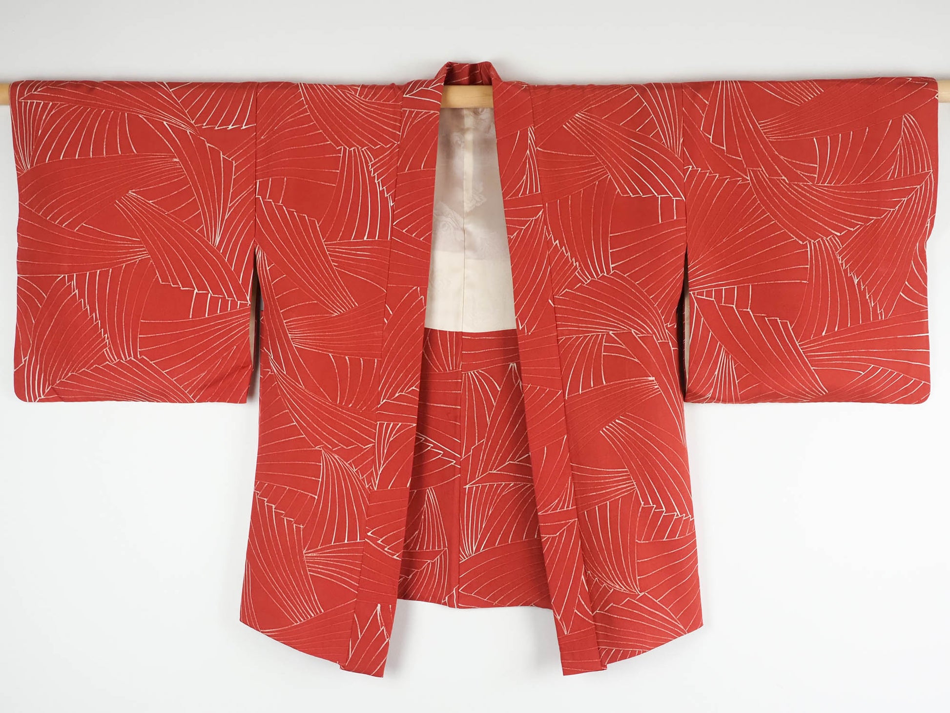 A coral red silk kimono jacket with a white overprinted abstract design representing pampas grass.